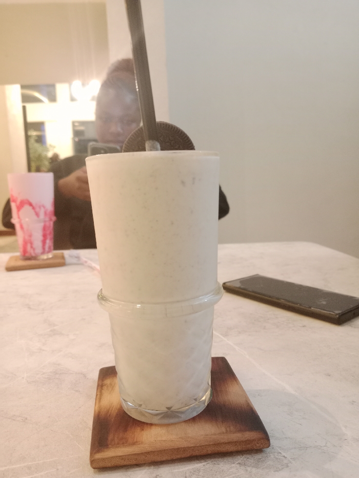 milkshake in a tall glass with a straw sticking out of the top. It sits on a wooden coaster on a white marble table. The milkshake is almost entirely white, with a faint hint of gray throughout. There is a cell phone on the table behind the milkshake to the right. The location is not clearly discernible, but it is likely a cafe or restaurant. There is a partial view of a person out of focus in the background. They appear to be holding a cell phone.