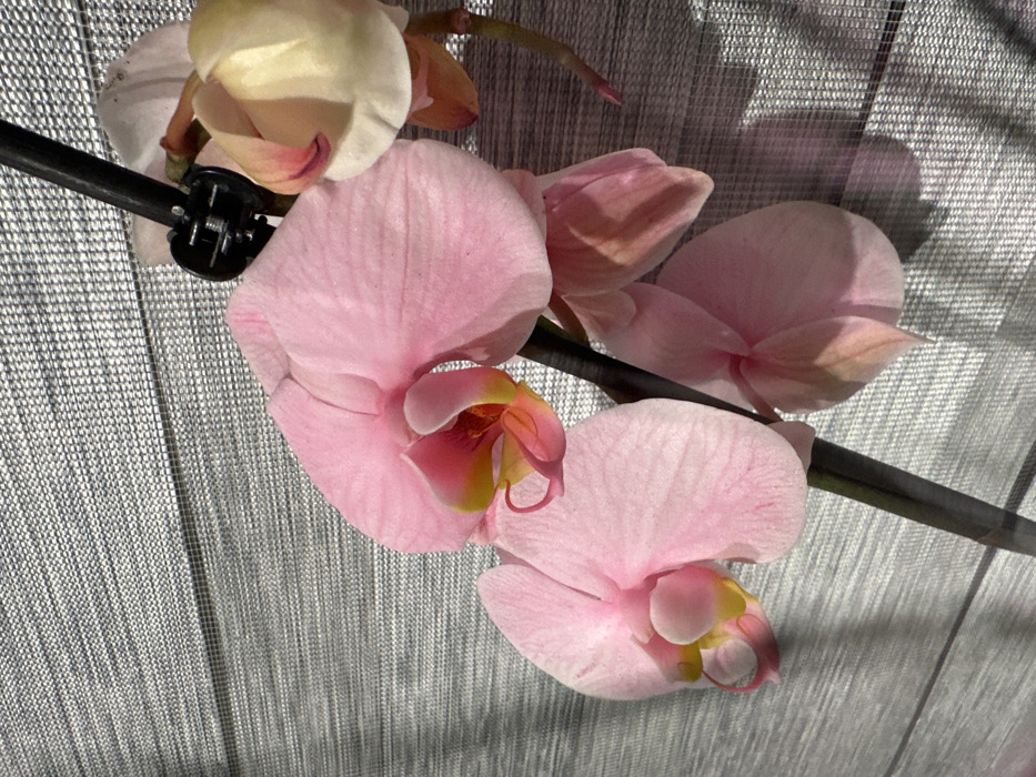 The scene displays a close-up view of a blooming Phalaenopsis orchid plant, positioned against a horizontally woven, textured gray background, consistent with a window blind or shade. A dark, slender flower spike, running vertically through the image, supports multiple blossoms and developing buds. Three prominent orchids in the foreground are fully open, exhibiting light pink petals with distinct yellow and orange coloration in their central labella. Several smaller, pink buds are observed below these open flowers, indicative of ongoing growth. To the upper right, a lighter, cream-colored orchid bloom or bud is present. A black plastic orchid clip is attached to the flower spike, positioned between the upper flowers, serving to stabilize the stem. Direct lighting from the left illuminates the plant, casting subtle shadows onto the background material. No people or human interaction are depicted. The location is in the city of Unknown, Unknown.