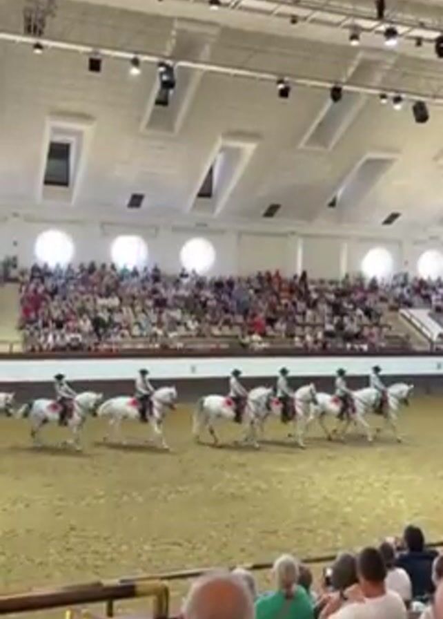 performance of riders on horseback. Riders in traditional attire are mounted on white horses. They perform as a group in an indoor arena, which has audience seating all around. The arena has a tan sand surface, and above the riders are overhead lights and white architectural panels.