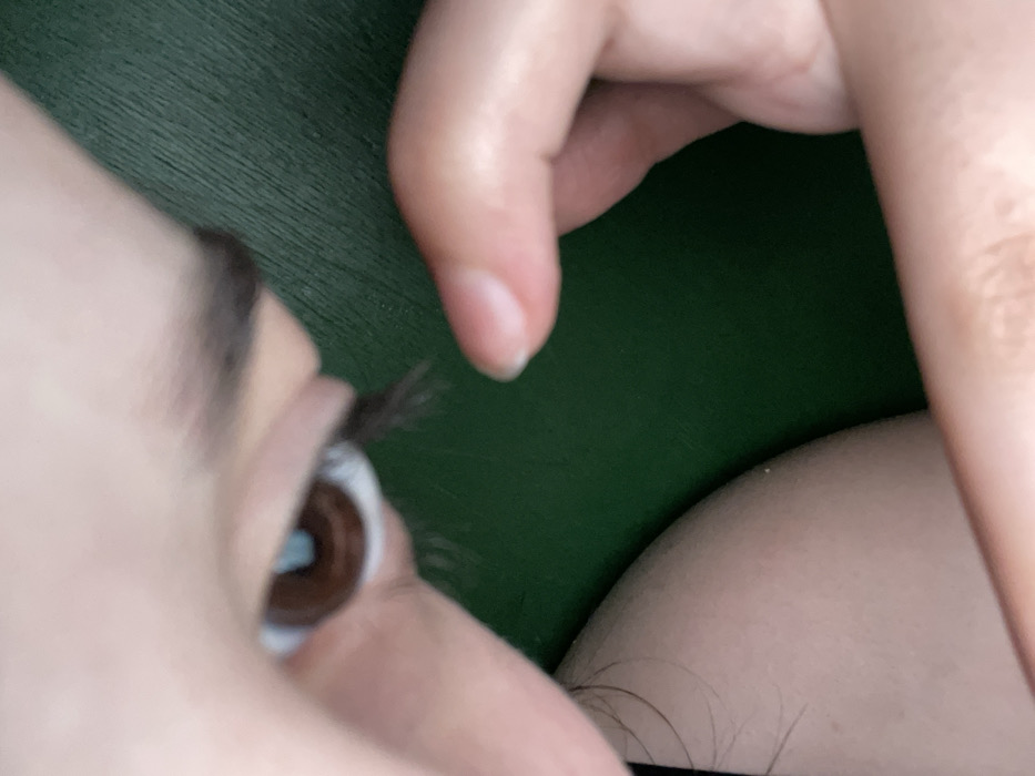 This image, captured in Saverne, France, presents a high-angle, close-up perspective focusing on human anatomy against a dark green, textured background. In the upper left quadrant, a brown human eye is visible, featuring dark eyelashes and a distinct light reflection within its pupil. The lower right quadrant displays a segment of a light-skinned human hand, with fingers positioned in a partial pinching or grasping configuration. The lower left of the frame shows a curved portion of bare, light-toned skin, consistent with a shoulder or upper torso, partially obscured by a dark fabric edge. No other identifiable objects or distinct actions are apparent.