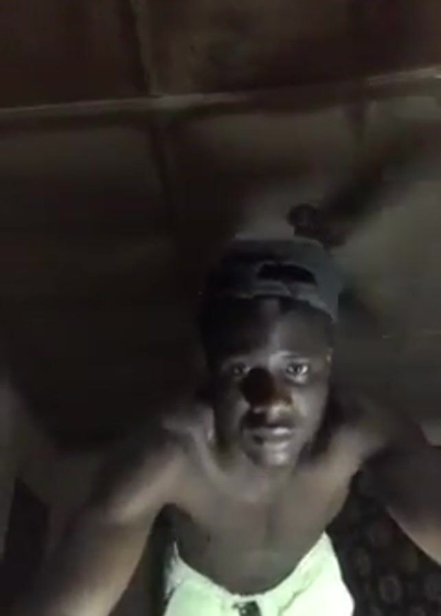 A shirtless, dark-skinned man wearing a backward baseball cap is facing the camera. He is in a dimly lit room with an unfinished ceiling. The man is moving slightly, perhaps exercising. The lighting is poor, casting shadows across his face and body. There is a ceiling fan visible in the background, but it appears to be stationary. A patterned wall is partially visible. The perspective is from below, looking upwards at the man.