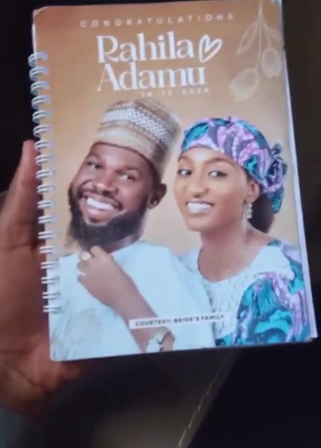 . The video shows a person holding a spiral notebook with a photo of a smiling couple on the cover. The notebook has a light brown background. The cover reads "Congratulations Rahila and Adamu 14.12.2024 Courtesy: Bride's Family." The couple in the photo is wearing traditional clothing. The man wears a patterned hat, and the woman wears a patterned headscarf. They are both smiling broadly. The person holding the notebook brings it closer to the camera to give a clearer view of the cover.