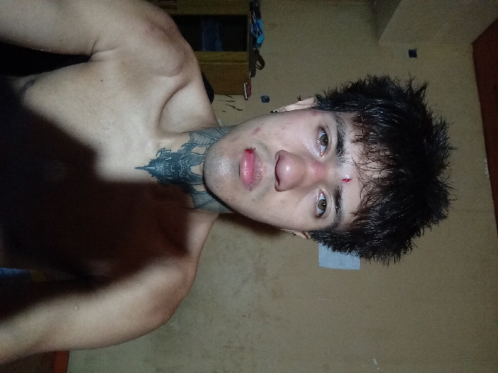 A shirtless man with dark hair and a neck tattoo faces the camera. He has a fresh cut on his forehead and a slightly bloody lip. The background is a tan-colored wall. A cabinet is visible in the upper left corner of the frame. His skin has a slight sheen, suggesting perspiration. A small, light-colored rectangular object is affixed to the wall behind his head.