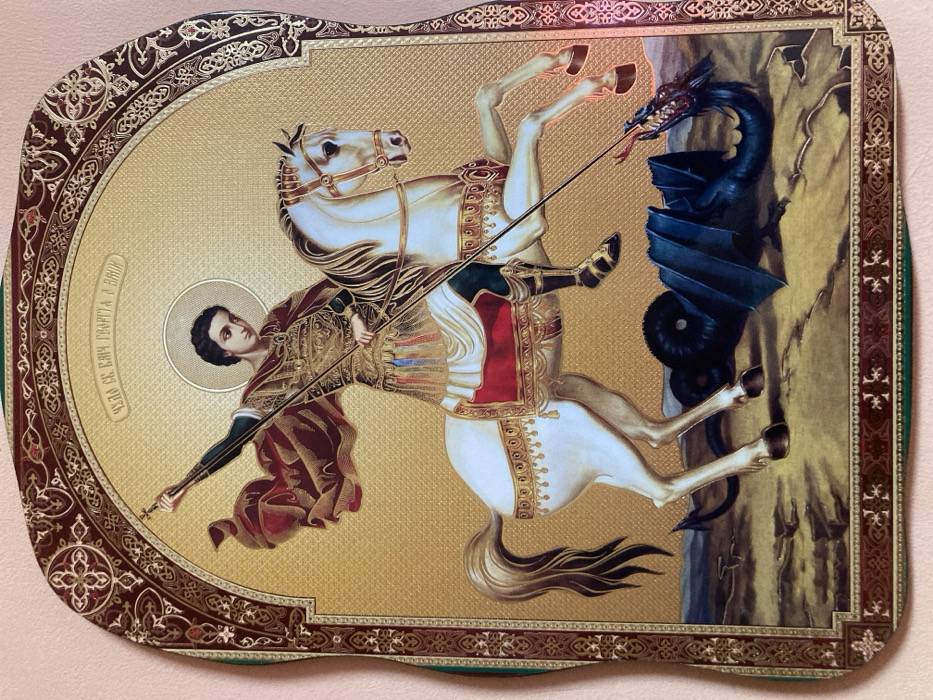 - "The image displays a vertically oriented religious icon, approximately rectangular with an arched top, depicting Saint George slaying the dragon" by FM-ccz603, licensed under CC BY 4.0