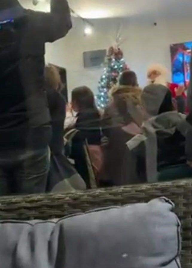 group of children gathered around Santa Claus in a brightly lit room, presumably for a Christmas event. A Christmas tree stands in the background. Several adults are standing around the perimeter of the group, some are recording the scene with their phones. The video is shot from behind a wicker couch, partially obscuring the view.