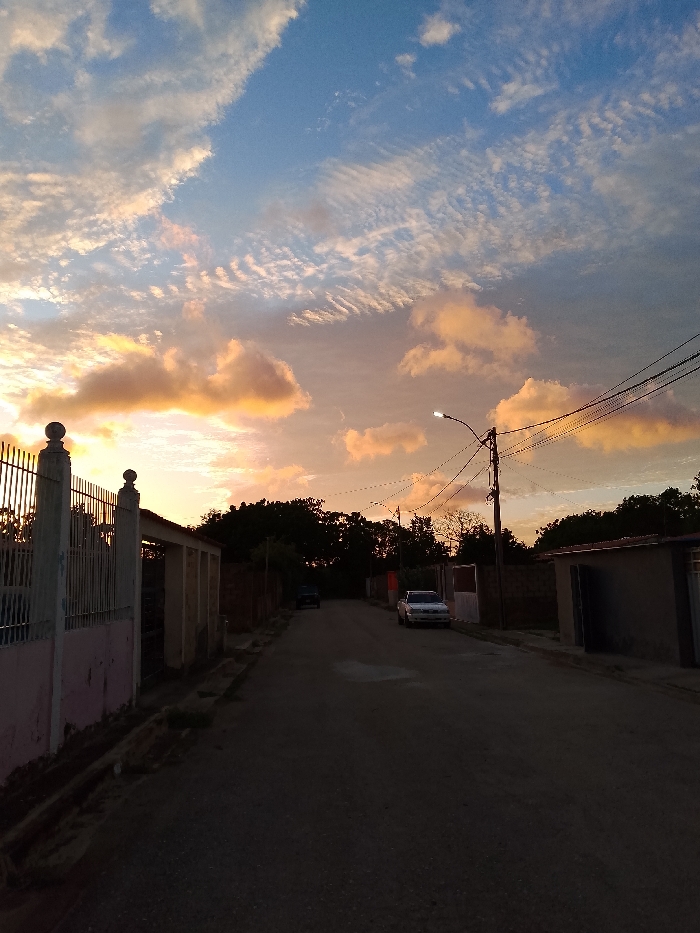 A quiet street scene unfolds under a captivating sky. Streaks of orange and yellow paint the clouds, contrasting with patches of blue. Buildings line the sides of the road, including a pink fence. A car is parked on the right side. A street light illuminates the scene near the car. The road stretches into the distance, flanked by silhouettes of trees.