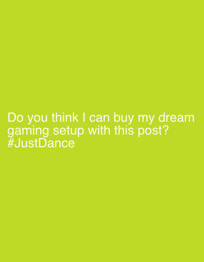 - "The image is a lime green background with white text that reads "Do you think I can buy my dream gaming setup with this post? #JustDance"" by FM-WQ3Oy2, licensed under CC BY 4.0