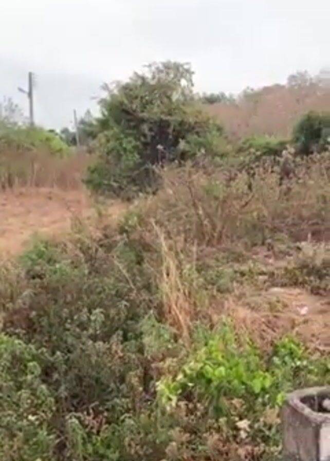 patch of land with varied vegetation, ranging from lush green shrubbery to dry, brown grass. In the distance, an unfinished concrete building with a water tank on top can be seen under an overcast sky. As the camera pans, a small pond or ditch is visible, and further away, more buildings are situated on the horizon. The general impression is of a developing or partially developed area. Power lines are visible overhead.