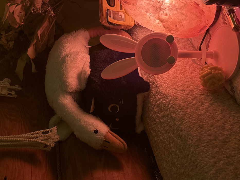 A plush black cat with crescent moon eyes and a white trim sits beneath a white swan toy with a tan beak. Above them, a pink children’s sound machine with bunny ears and green buttons rests near a pink salt lamp and a yellow toy car. All of this is set on a wooden surface near a tan, textured carpet. The lighting creates warm red and orange hues.