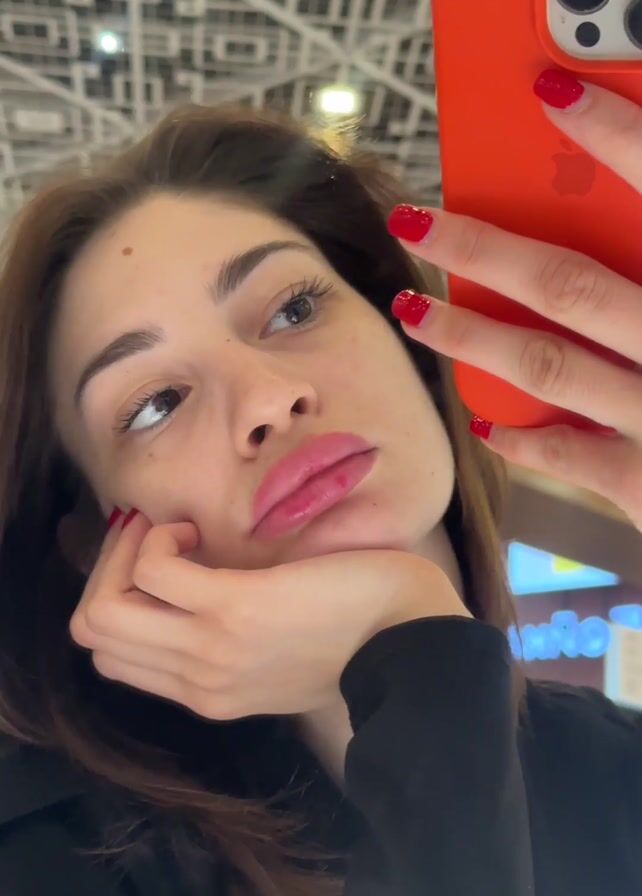 A woman with brown hair takes a selfie with an orange iPhone. She wears a black top and has red nail polish. Her head rests on her hand, and she looks slightly upward. The background is an indoor setting, possibly a shopping mall, with a visible ceiling structure and blurry signs.
