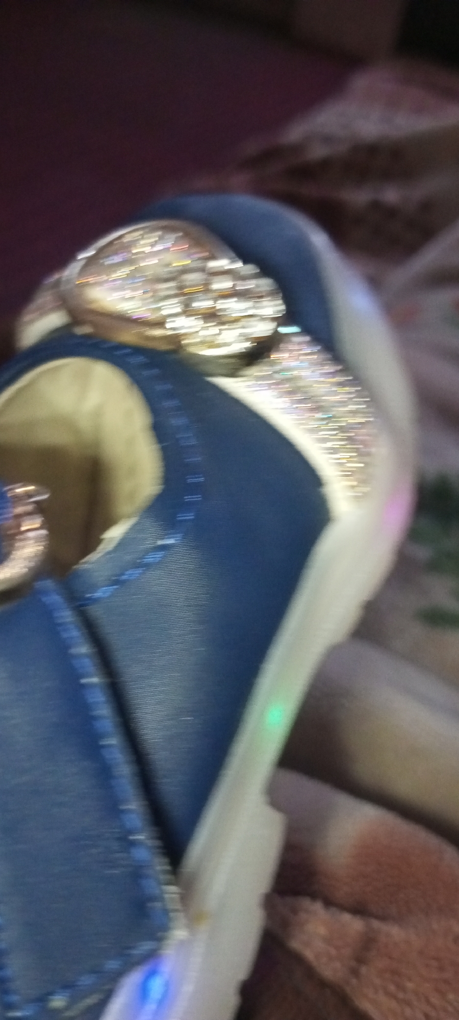 The image displays a blurry, close-up view of a single light-up shoe, likely intended for a child, situated indoors in Mansehra, Pakistan. The shoe is predominantly deep blue, featuring visible lighter stitching and a light-colored interior lining. A large, reflective, multi-faceted embellishment, possibly a buckle or ornamental clasp, is centered on the upper part of the shoe, appearing as horizontal streaks of bright, multi-colored light due to motion blur. The shoe's translucent white sole exhibits illuminated internal light-emitting diodes (LEDs), displaying distinct points of green, blue, and pink light. The shoe rests on a textured, reddish-brown fabric surface, consistent with a blanket or carpet. The upper background is a dark, undefined area. No human subjects, explicit actions, or interactions are visible within the frame. The photograph is characterized by significant motion blur and indications of low-light conditions.