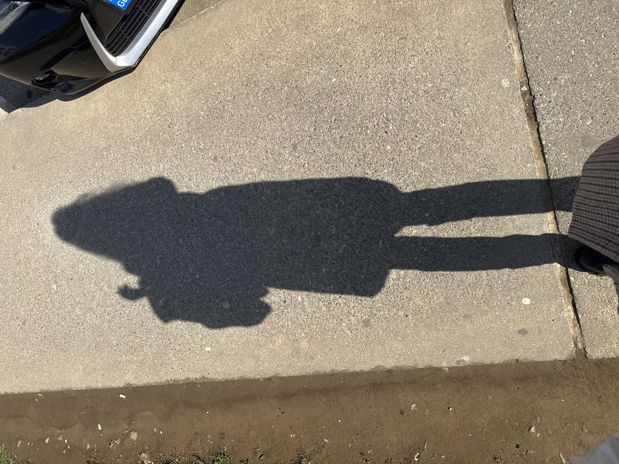 The image depicts a section of concrete sidewalk adjacent to a curb in an urban environment. The shadow of a person is cast on the sidewalk, indicating a sunny day. A portion of a car is visible in the upper left corner, and a person wearing a plaid garment is visible to the right. The sidewalk adjoins a patch of dirt.