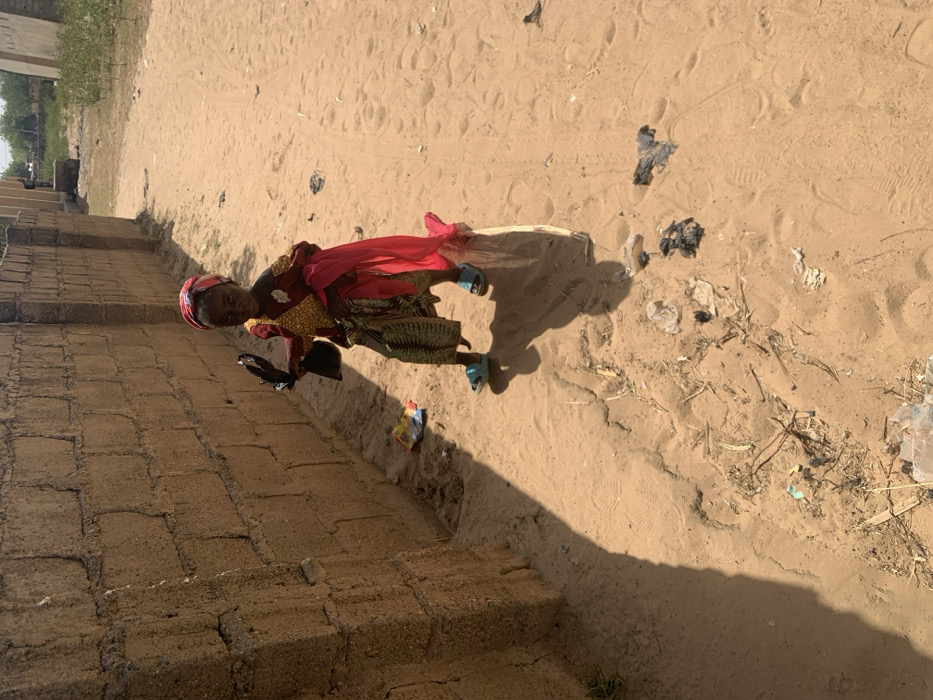 A young child stands on a sandy path in Dabawa, Nigeria. The child, wearing a red headscarf, a patterned dress with red, yellow, and green sections, and light blue sandals, holds a black plastic bag containing dark, crumpled items in their right hand. A long piece of pink fabric drapes from their left hand, reaching towards the ground. To the left, a textured concrete block wall casts a sharp shadow across the sandy ground. Scattered debris, including plastic wrappers and organic matter, is visible on the sand. The background features more sandy ground, sparse vegetation, and distant structures under a clear sky. Strong sunlight illuminates the scene, creating distinct shadows.
