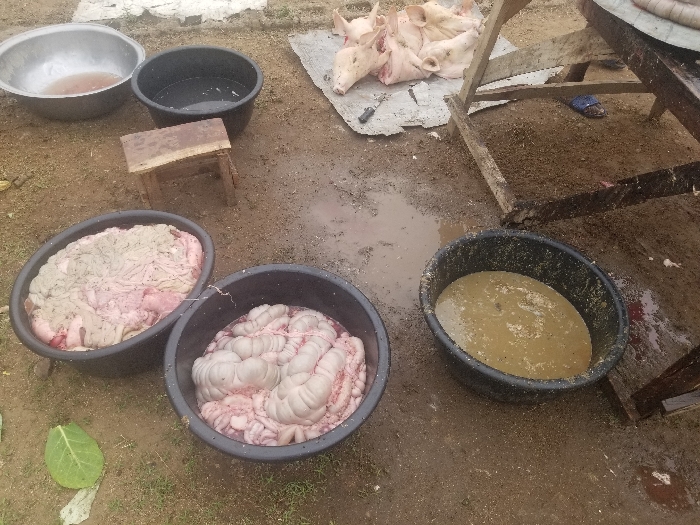 The scene is an outdoor area in Pati Ridge, Nigeria, located at latitude 7.81 and longitude 6.704. There are several black plastic basins filled with animal innards and a brown liquid, likely water or wastewater. The innards appear to be pig intestines. There is a small wooden stool and a large metal bowl on the ground. In the background, there is a wooden table, a metal bowl, and a pile of pig carcasses laid out on a piece of white material. There is a knife on the material. There is an unknown object in the lower right corner of the image, along with a splatter of blood. The ground is dirt and the overall environment appears to be wet and muddy. There are no people visible in the image. The scene appears to be part of a butchering process.
