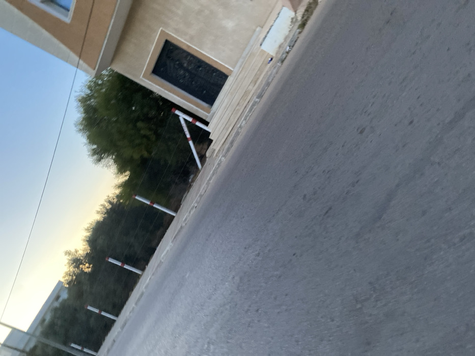 A street scene is captured at an oblique angle. A house with a dark-colored door and a visible window is on the left. A series of white and red posts create a boundary line. The foreground is dominated by a gray asphalt road. The sky is visible in the background, transitioning from a bright blue to a softer yellow near the horizon. Trees line the left side of the street.