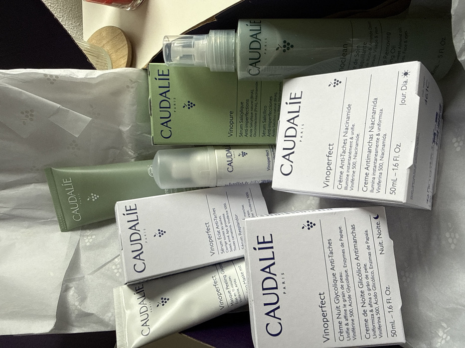 - "The image displays an assortment of Caudalie brand skincare products contained within a dark-colored box, which is partially lined with crumpled white tissue paper featuring a faint, repeating grape-leaf pattern" by FM-wbD9n1, licensed under CC BY 4.0