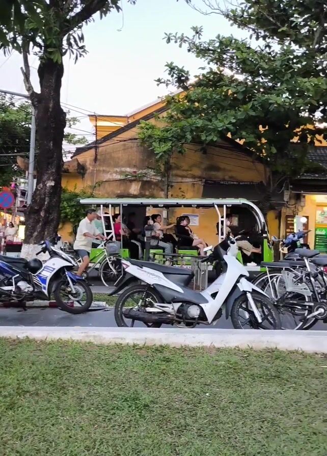 The scene captures a street in an urban area, possibly in Southeast Asia. A row of motorbikes and bicycles are parked along the edge of a grassy area. In the background, there is a yellow building with weathered walls and signs above the entrance. A green electric vehicle with several passengers is driving along the street, while a man on a bicycle is riding in the same direction. Other pedestrians can be seen walking in the background, and the scene is framed by trees with abundant green foliage. The overall setting suggests a bustling urban environment with a mix of traditional and modern modes of transportation.