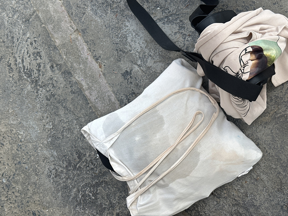 The scene depicts a static arrangement of personal items on a textured concrete or asphalt surface in Baan Hua Thanon, Thailand. A light-colored, possibly beige or off-white, fabric tote bag lies flat on the ground, exhibiting multiple damp or stained areas across its upper surface and two sets of light-colored fabric straps. Adjacent to and partially beneath the tote bag is a crumpled, light-colored garment, possibly beige, which displays a graphic design featuring black curvilinear lines and a central colored image resembling an abstract fruit or object in green and brown hues. A black fabric strap, possibly from a shoulder bag, extends over the crumpled garment, with a black object partially visible underneath. The ground surface appears worn, with minor textural variations and faint linear markings. No individuals are present in the image.