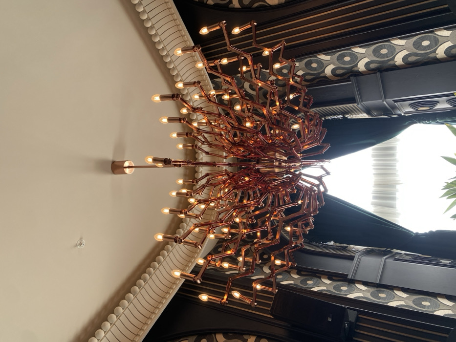 The image displays an interior scene, observed from an upward angle, focused on a prominent chandelier and surrounding architectural elements. **Location:** This scene is located within **Hotel Moskva, Belgrade, Serbia**, specifically in one of its public areas, such as the Opera Restaurant or Winter Garden. **Objects and Environment:** * **Chandelier:** Dominating the central frame is a large, multi-arm chandelier constructed from rose gold or copper-toned metallic components. Its design is abstract, featuring numerous angular, branching segments that extend outwards from a central stem, resembling a spiky or molecular structure. Approximately 40-50 small, unshaded incandescent bulbs are affixed to the ends of these segments, all illuminated and emitting a warm, orange-yellow light. The chandelier is suspended from the ceiling by a single rose gold-colored rod. * **Ceiling:** The ceiling is off-white or pale cream, with a distinct decorative frieze or cornice molding running along its perimeter where it meets the walls. This molding features a repeating pattern of convex, scallop-like shapes. A small, white circular smoke detector is visible on the ceiling surface towards the upper left quadrant. * **Walls:** The visible wall sections are dark, predominantly covered with a geometric wallpaper. The wallpaper pattern consists of repeating concentric circles in shades of black, gray, and beige. Interspersed with the wallpaper are vertical dark wooden panels or columns, some with decorative trim. * **Windows and Curtains:** Below the chandelier, a large window opening is visible, providing a source of bright, diffused light, indicating daylight outside. The window is framed by heavy, dark green velvet curtains, pulled back to the sides. A layer of sheer, white curtain is also visible between the main curtains and the window. * **Other Details:** A small portion of green foliage, consistent with an indoor potted plant, is visible at the very bottom center edge of the frame, below the window. No individuals or overt actions are present in the scene.
