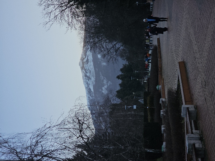 The image displays an outdoor public park in Sofia, Bulgaria, with a prominent view of the snow-capped Vitosha Mountain against a clear, pale blue sky. The scene suggests late afternoon or early evening during the winter season, indicated by bare deciduous trees and the low-angle natural light. A wide paved promenade, constructed from interlocking bricks, extends from the foreground into the midground, curving gently towards the right. To the left of the promenade, landscaped beds containing dormant shrubs are bordered by concrete planters that also integrate concrete benches. Numerous bare deciduous trees, including a slender, weeping variety on the far left, and dark evergreen trees are interspersed throughout the park. Modern park lampposts with dark poles and white fixtures are visible along the path, some bearing white informational signs. In the right foreground, two individuals walk hand-in-hand on the promenade. The person on the left (viewer's perspective) wears a dark, long coat and dark trousers. The person on the right wears a blue jacket, dark trousers, and a light-colored beanie. Further down the promenade in the midground, a group of approximately 15-20 individuals is visible, many wearing brightly colored winter jackets, also engaged in walking.