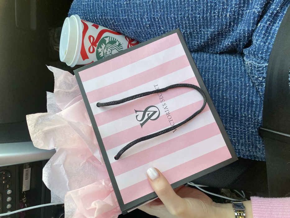 The scene depicts a close-up, downward-angled view inside a vehicle, located in the city of Călărași, Romania. A person's left hand, with white painted fingernails and a silver and gold wristwatch, holds a Victoria's Secret shopping bag. The bag features vertical pink and white stripes, black rope handles, and the "VS Victoria's Secret" logo in black. Light pink tissue paper is visible crumpled at the top opening of the bag. To the right of the bag, a Starbucks paper cup with a white lid rests against a textured blue fabric, consistent with clothing. The cup displays a red and white holiday design with bows and ribbons, along with the green Starbucks siren logo. In the background, elements of a vehicle's interior, including dark panels and white wiring, are partially visible. A black strap, likely a seatbelt, crosses the lower part of the frame.