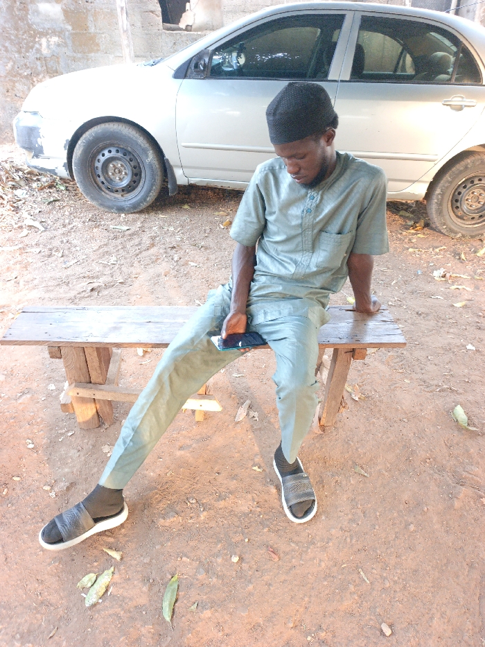 The scene depicts an outdoor area in Akwanga, Nigeria, characterized by reddish-brown earth and scattered dry leaves. A dark-skinned adult male is seated on a simple, rough-hewn wooden bench. He wears a dark knitted cap, a light greenish-gray short-sleeved tunic with a button-up collar, and matching trousers. His feet are clad in black socks and dark gray open-toed slides with white soles. The individual holds a black smartphone, featuring a visible green edge, in his left hand, resting it on his left thigh, and is looking downwards. In the background, parked on the same reddish-brown earth, is a silver sedan, identifiable as a Toyota Corolla, exhibiting a damaged front driver-side bumper and steel wheels without hubcaps. A light-colored concrete block wall is partially visible in the far background.