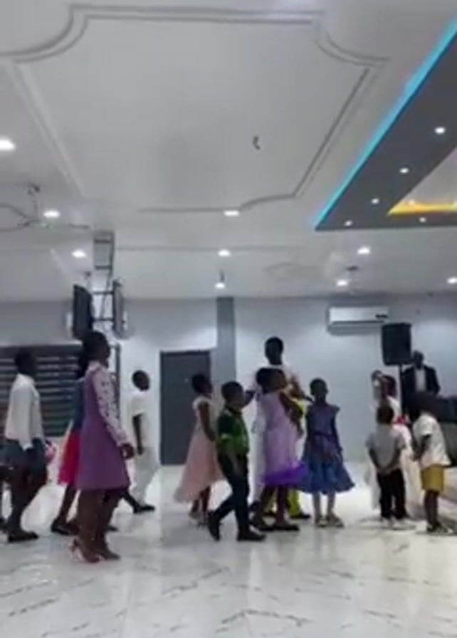 A group of children, accompanied by at least two adults, are walking in a line across a large room. The children are dressed in various outfits, including dresses, shirts, and shorts, and some of them are wearing shoes that appear to be heels. The adults are guiding them and helping them to stay in line. The room is decorated with a modern design, including a patterned floor, recessed lighting, and decorative ceiling features. There are also speakers, an air conditioning unit, and a television visible in the room. Some adults are seated watching from the left of the frame.