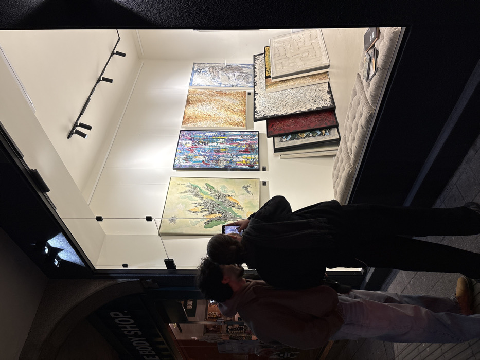 An nighttime image taken from a sidewalk in Sofia, Bulgaria, shows two individuals observing an art gallery window display adjacent to a "THE BODY SHOP" storefront