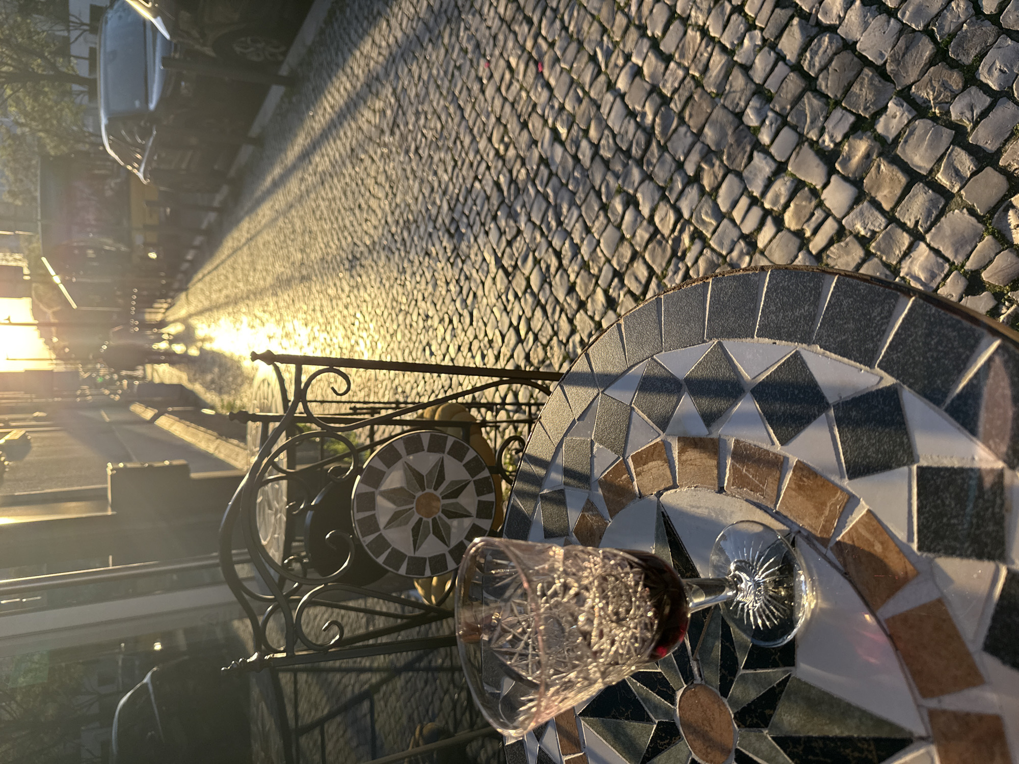 A tilted eye-level shot shows a table and chair on a cobblestone street with sunlight casting long shadows. A mosaic-tiled table has a partially filled wine glass on it. The chair has an ornate metal back, also with a mosaic tile. The street stretches into the distance with parked cars on the left. The location is likely Lisbon, Portugal due to the characteristic cobblestone streets.
