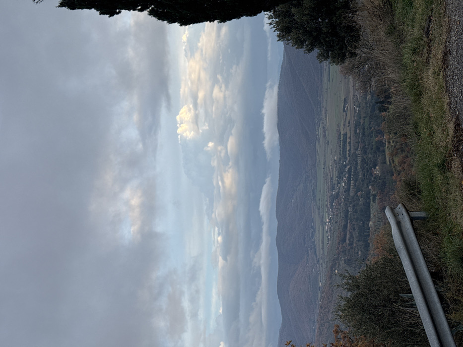 A landscape photograph shows a vast valley filled with fields and small towns. Mountains rise on one side, fading into the distance under a sky filled with clouds, some catching the sunlight. A roadside with a metal barrier is visible in the foreground. The orientation of the photo is vertical.