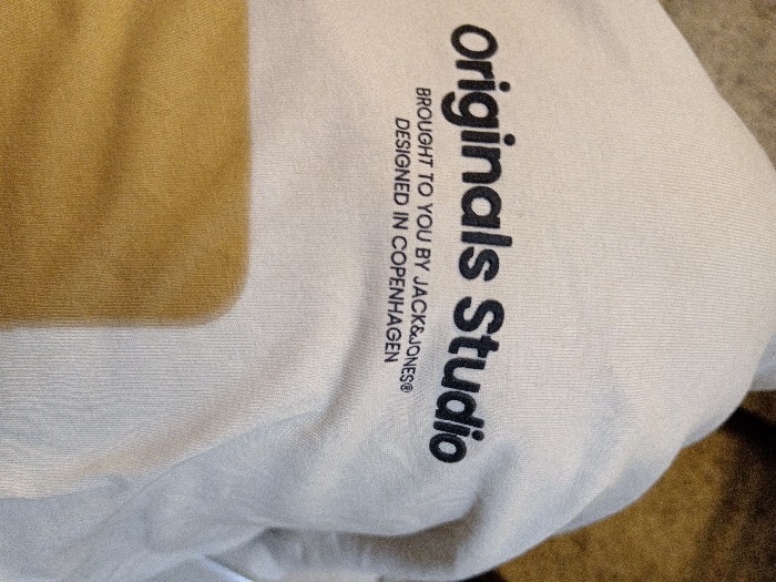 A close-up, top-down view of light grey textile fabric, located in Ijoko, Nigeria. The fabric exhibits a fine, horizontal weave and features black printed text. The primary text reads "originals Studio" vertically in a large, bold, sans-serif font. Below this, in a smaller, horizontal sans-serif font, are the words "BROUGHT TO YOU BY JACK&JONES® DESIGNED IN COPENHAGEN". A distinct rectangular section of mustard yellow fabric is visible on the left side of the frame, integrated into the textile design. No individuals, specific actions, or additional environmental elements are discernible within the image.