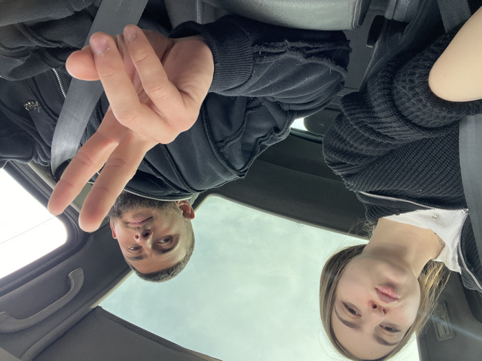 Two individuals are seated inside a vehicle in Razlog, Bulgaria. On the left, a female with brown hair and light skin wears a white shirt beneath a black knit zippered cardigan. She faces the camera with her lips puckered. A seatbelt is secured across her left shoulder and chest. On the right, a male with short dark hair, a beard, and light skin wears a black distressed zippered hoodie. He faces the camera, extending his right hand to form a peace sign gesture. A seatbelt is secured across his right shoulder and chest. The vehicle's dark interior features a sunroof overhead, through which an overcast sky is visible. A center console or armrest is positioned between the two subjects.