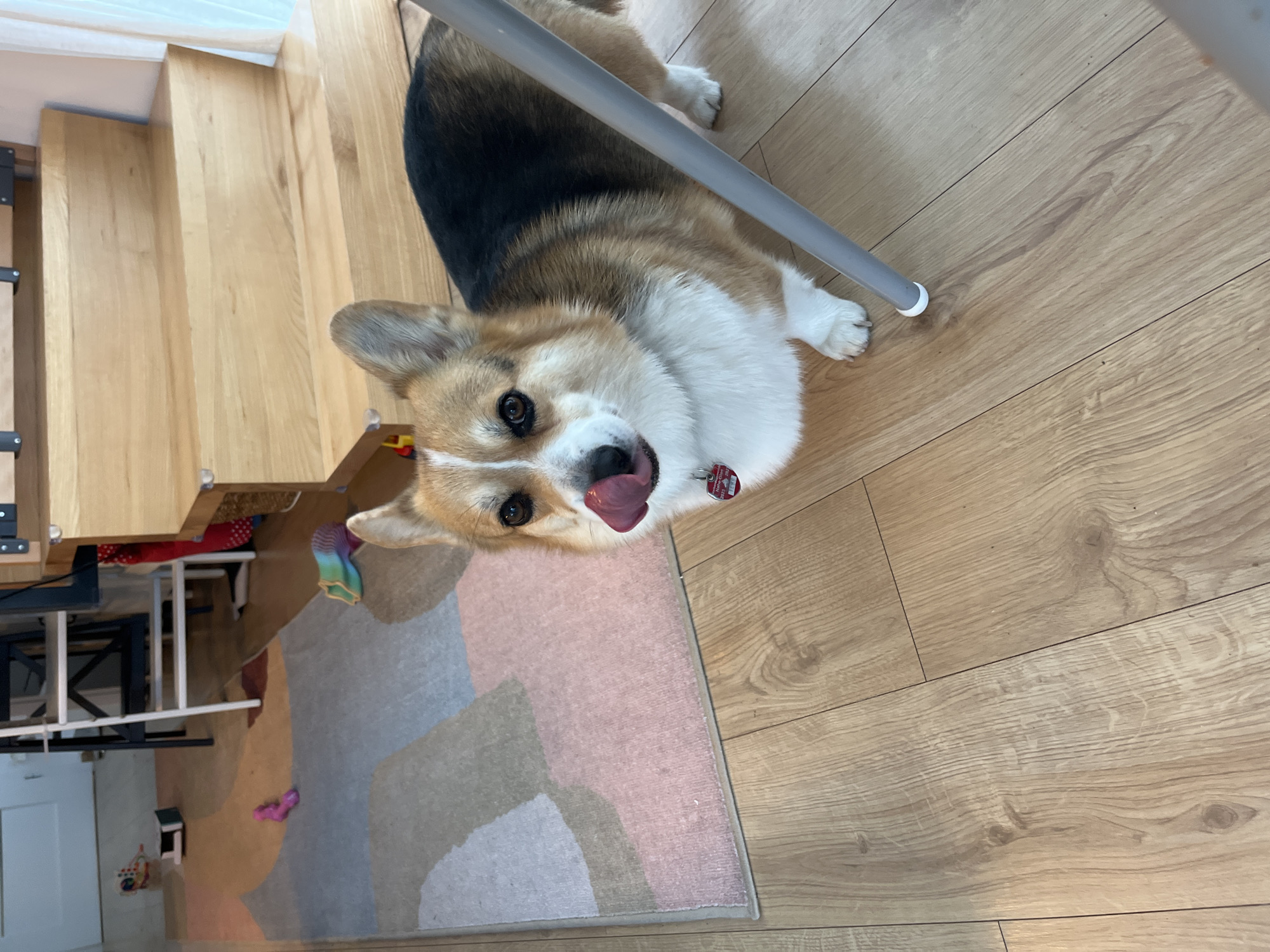 A Corgi dog lies on a wooden floor with a colorful rug nearby. The dog is looking upwards, with its tongue sticking out. A grey chair leg is visible above the dog. Wooden stairs are situated on the left side of the image. The location is not mentioned.
