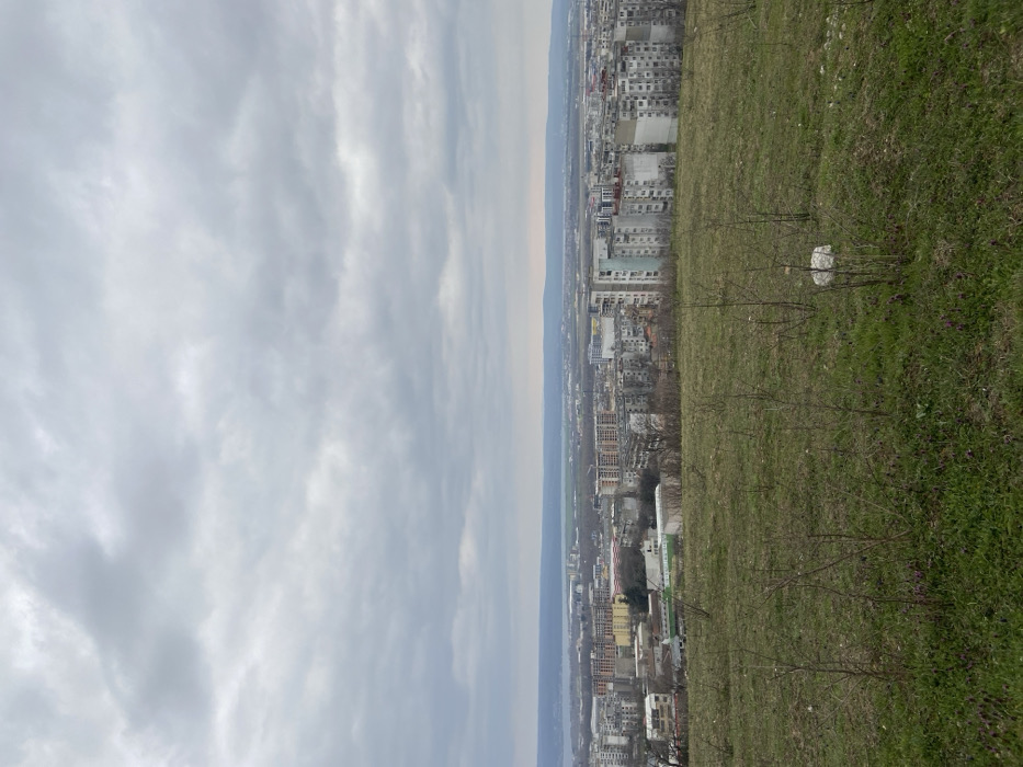 The image presents an elevated, panoramic view of the city of Varna, Bulgaria, under an overcast sky. The immediate foreground consists of a gently sloping expanse of dry, sparse green and brown grass, interspersed with numerous small, bare deciduous shrubs. Patches of small purple flowers are visible near the lower left edge. A single white object, possibly a stone or discarded item, rests on the grass towards the lower right. The midground reveals a dense urban environment comprised primarily of multi-story residential buildings, many characteristic of Eastern European panel block architecture with their uniform, rectangular shapes and muted grey, beige, and light blue facades. Newer, taller structures and various commercial or industrial buildings with flat roofs are also present. In the background, a significant body of water, identified as Varna Lake or Varna Bay, stretches horizontally across the scene. Beyond the water, a low, indistinct landmass or further distant urban/industrial development is visible on the horizon. The entire sky is covered by a uniform, unbroken layer of grey, overcast clouds, indicating diffuse light conditions. No human figures are discernible.
