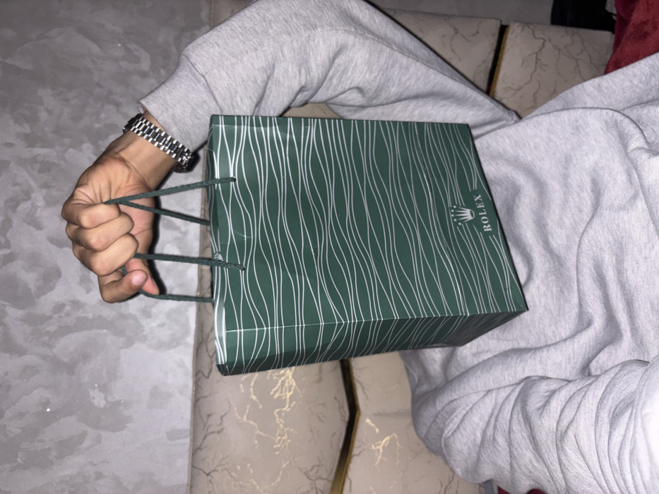 - "A person wearing a gray sweatshirt and a metal watch holds a dark green Rolex shopping bag with white wavy lines" by FM-wL3YJ2, licensed under CC BY 4.0