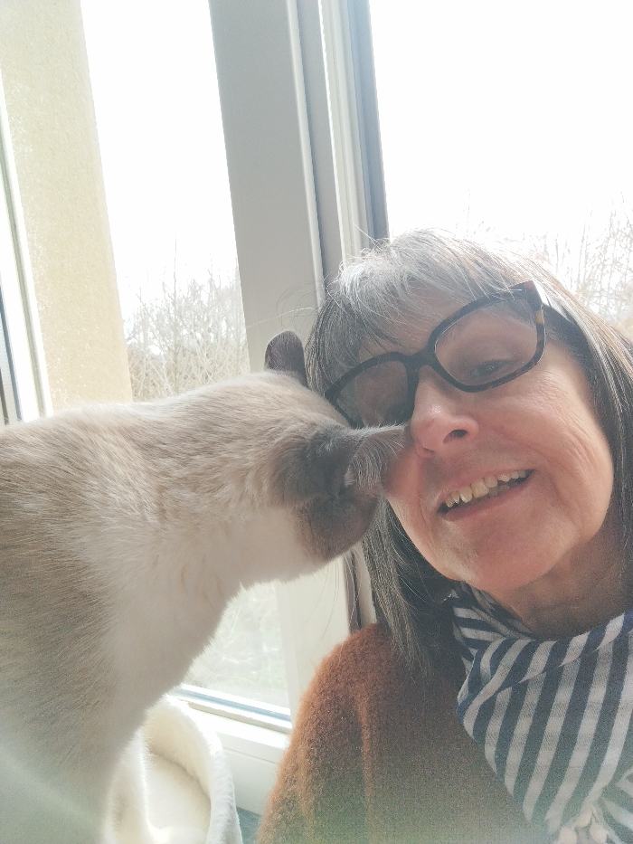 The image depicts a close-up, selfie-style scene featuring an adult female and a domestic cat indoors in Montélimar, France