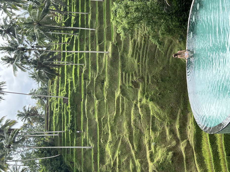 The scene depicts a verdant agricultural landscape in Tegal Suci, Indonesia, featuring a series of meticulously carved green rice terraces ascending a hillside under an overcast sky. Numerous tall palm trees are interspersed throughout the terraces and along the ridges. In the foreground, a dark-rimmed infinity pool contains clear turquoise water. A female individual, clad in a white two-piece swimsuit, is partially submerged in the pool, facing away from the camera and observing the distant rice terraces. A second, smaller figure, consistent with an adult male in light clothing, stands on one of the higher rice terraces in the upper-left background.