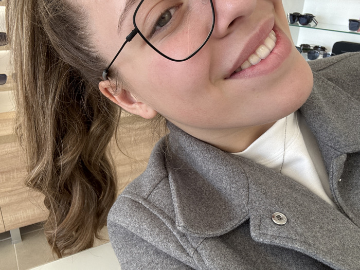 A close-up, slightly tilted selfie captures an individual, likely female, smiling directly at the camera. The subject has fair skin, brown wavy hair pulled back, and is wearing thin-rimmed dark eyeglasses. A grey, possibly wool-blend, coat with a visible silver snap button on the collar is worn over a white top, accented by a thin silver necklace. The background is blurred but shows an indoor commercial setting. To the right of the subject, multiple pairs of sunglasses or eyeglasses are displayed on clear glass shelving units. To the left, a section of a light-colored wooden or laminate cabinet is visible. The specific location within the city of Kostinbrod, Bulgaria, is not discernible from the visual information provided in the image.