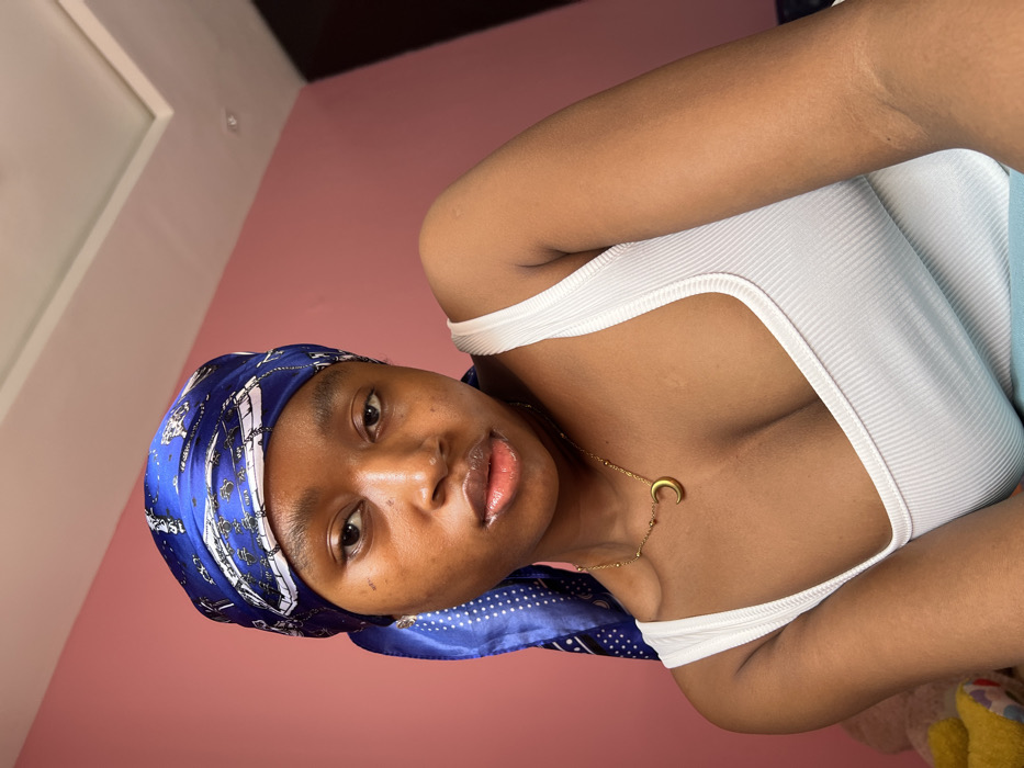 A close-up portrait, purportedly taken in Odo Ogun, Nigeria, depicts a young adult female with dark brown skin, gazing directly into the camera. She is wearing a blue silk headscarf patterned with white chains and medallions, a white ribbed tank top, and a gold-colored necklace with a crescent moon pendant. A small, faint mark is present on her left cheekbone. The background features a plain light pink wall, with a segment of a white recessed ceiling visible in the upper right. A blurry yellow object in the lower-left corner suggests an indoor, domestic environment.