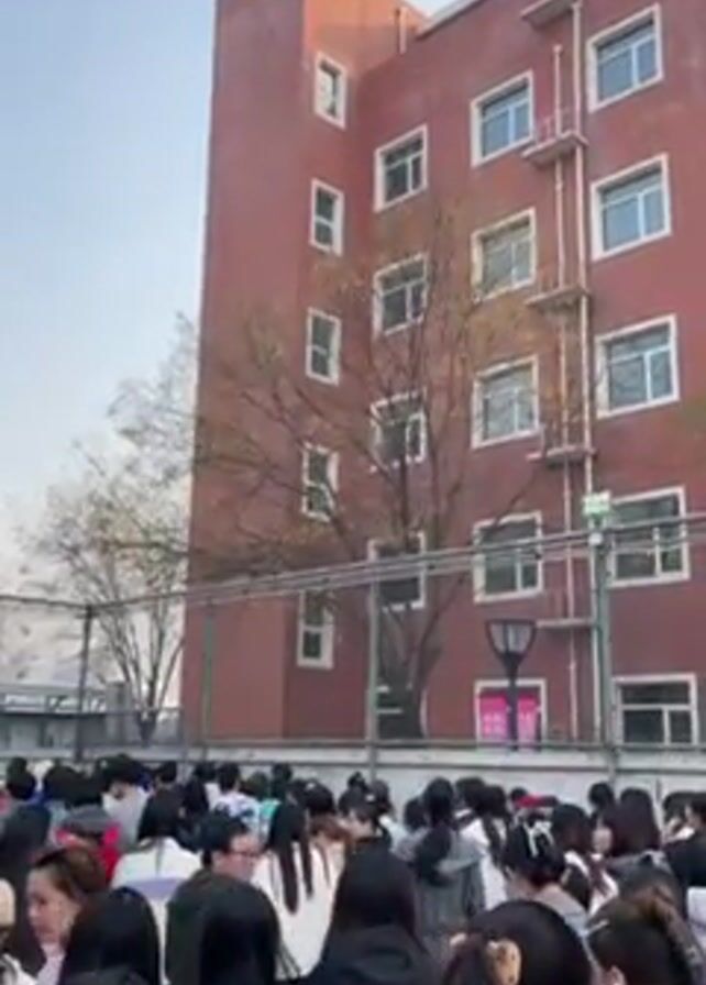 A large group of people is standing outside a reddish-brown brick building, likely a dormitory or academic building based on its appearance. The people are diverse in age and appearance, and they are dressed in various casual clothing. There is a chain-link fence that appears to enclose an outdoor area, possibly a courtyard or athletic field. The sky is a clear, pale blue. The camera pans slightly to the right.