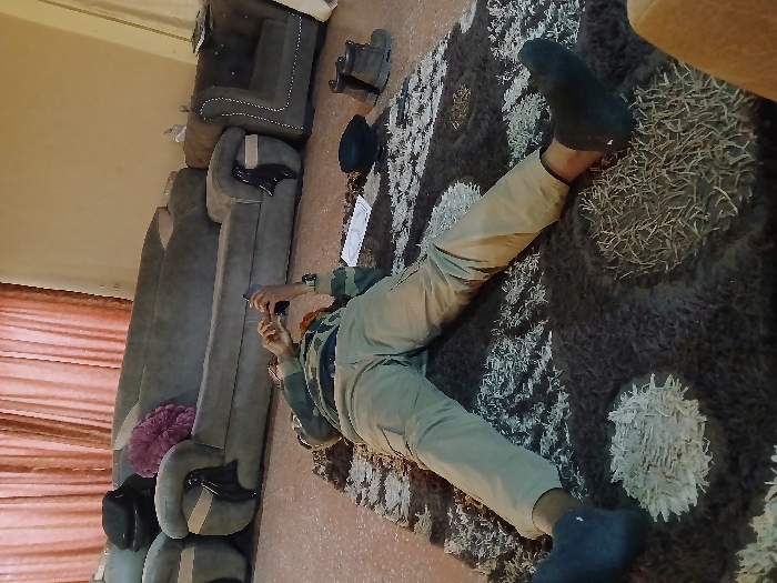 Within a domestic interior in Nata, Botswana, a male individual is depicted lying supine on a dark brown, shag-style area rug with light circular and abstract patterns. The individual wears a camouflage-patterned long-sleeved shirt, light khaki cargo pants, and dark socks. A dark-colored wristwatch is visible on the left wrist. Both hands are raised, holding a dark-colored smartphone, with the individual's focus directed towards the device's screen. Adjacent to the individual's right side, on the rug, a white document or paper is visible. Further right, a black beret-style hat and a pair of brown leather lace-up boots are positioned on the rug. In the background, a long, dark grey upholstered three-seater sofa with a purplish cushion on its left armrest is present. To its right, a single-seater upholstered armchair of similar dark grey material, featuring decorative stitching, is positioned. The room's walls are painted a light yellow or cream color. Reddish-brown curtains cover windows in the far background. The floor beneath the rug is tiled in a reddish-brown color.