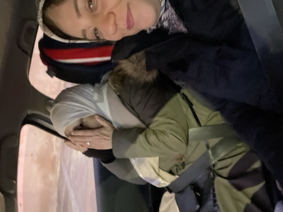 A woman with light skin takes a selfie inside a vehicle. The image is tilted sideways. A second person, wearing a head covering and a green jacket, sits beside her, face obscured by their hands. A seatbelt is visible across their body. The car's interior is visible, including the window and part of the car door. The background outside the window appears blurry and indistinct.
