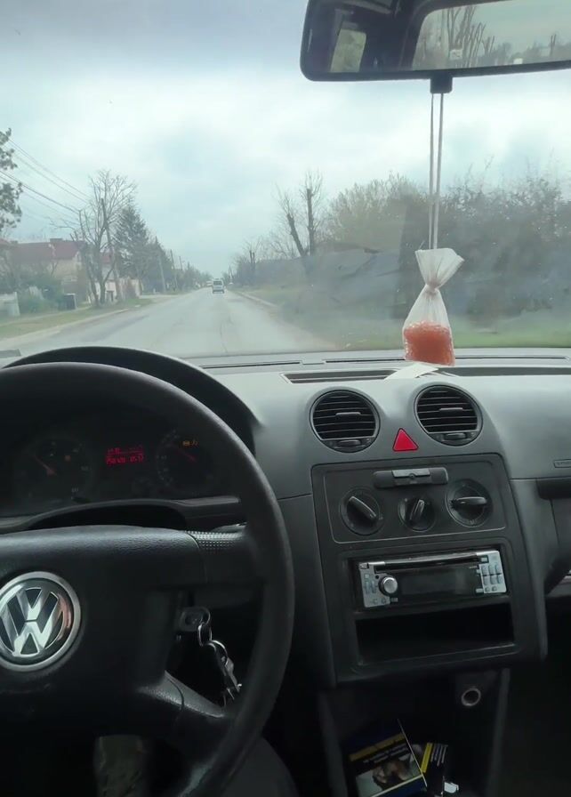 The interior of a Volkswagen Caddy van is shown from the driver's perspective, driving on a wet, overcast day. The dashboard is visible, with the steering wheel on the left, and the car keys in the ignition. A bag of orange-colored seeds or fish food hangs from the rearview mirror. There's a cigarette pack on the center console. Outside, the road is wet, with houses and bare trees lining the street. A car is visible in the distance.
