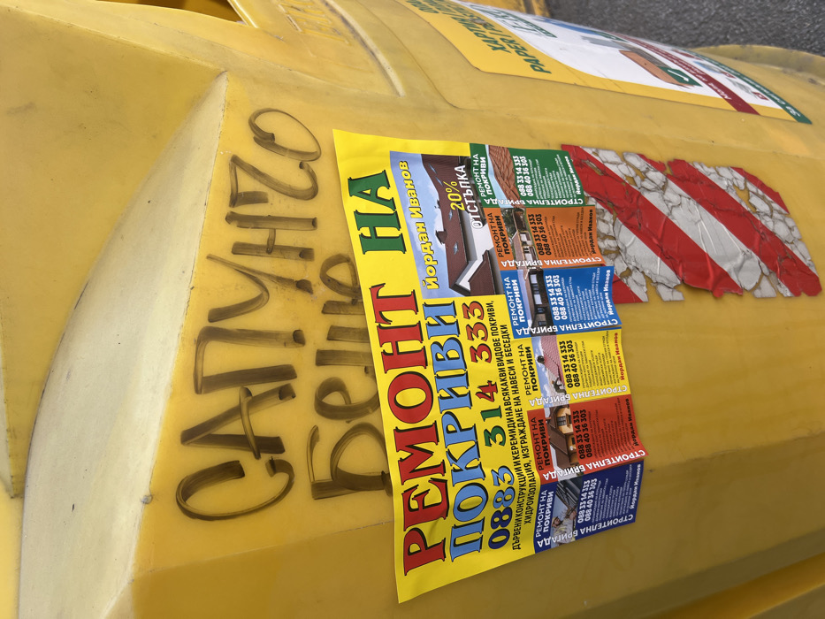A yellow plastic recycling bin, marked with "ХАРТИЯ / PAPER" on its right side, stands outdoors on an asphalt surface. Dark brown handwritten Cyrillic text, reading "САПУНЧО БЕЛ" (Sapunchо Bel - Little White Soap), is inscribed on the upper part of the bin. Multiple paper advertisements are affixed to its front. A large, yellow-dominant flyer, prominently displaying "РЕМОНТ НА ПОКРИВИ" (Roof Repair) in red and blue Cyrillic, with a phone number "0883 314 333" and the name "Йордан Иванов," is centrally placed. This flyer features an image of a house with a repaired roof. Below and partially to the right of this main flyer, several smaller, horizontally oriented versions of the "Roof Repair" advertisement are visible in various colors (yellow, red, blue, green), also showing houses, phone numbers (including "088 33 14 333" and "088 40 36 303"), and advertising a "20% ОТСТЪПКА" (20% Discount) on one instance. Below these flyers, a weathered, torn sticker featuring red and white diagonal stripes is present. The specific street or area within Sofia, Bulgaria, cannot be determined from the visual information provided.