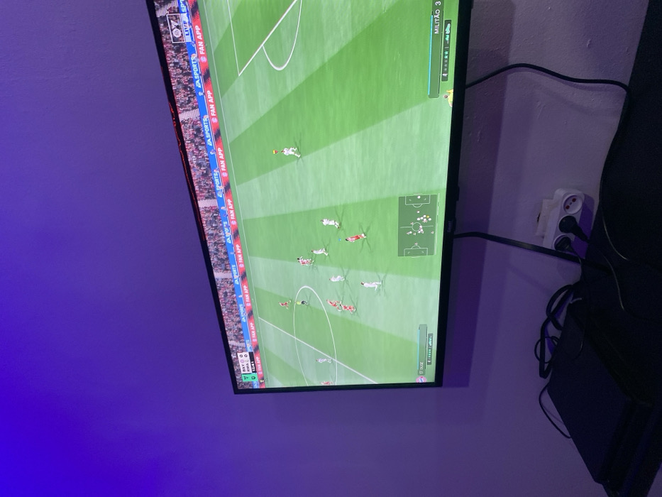 A tilted shot shows a television screen displaying a soccer game with players in red and white jerseys on a green field. "FAN APP" logos are visible along the sidelines, along with "LIVE SPORTS" text. The score indicates a 0-0 tie. A player named "MILITÃO" is highlighted. Wires from the television run towards a multi-socket outlet and a black box, possibly a gaming console. The wall is painted a pale purple hue with blue lighting.