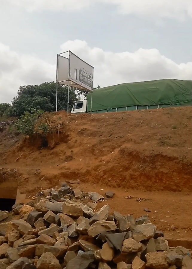 low-angle view of a roadside scene on a cloudy day. The foreground is dominated by a pile of gray rocks and dirt. Behind the rocks is a small, tunnel-like opening, likely for drainage. A dirt embankment rises behind the rocks. On top of the embankment is a large, rectangular billboard with a black and white image on it. To the right of the billboard, a large truck covered with a green tarp can be seen briefly passing by. The sky is overcast with white clouds. The overall impression is of a construction or repair site near a road.