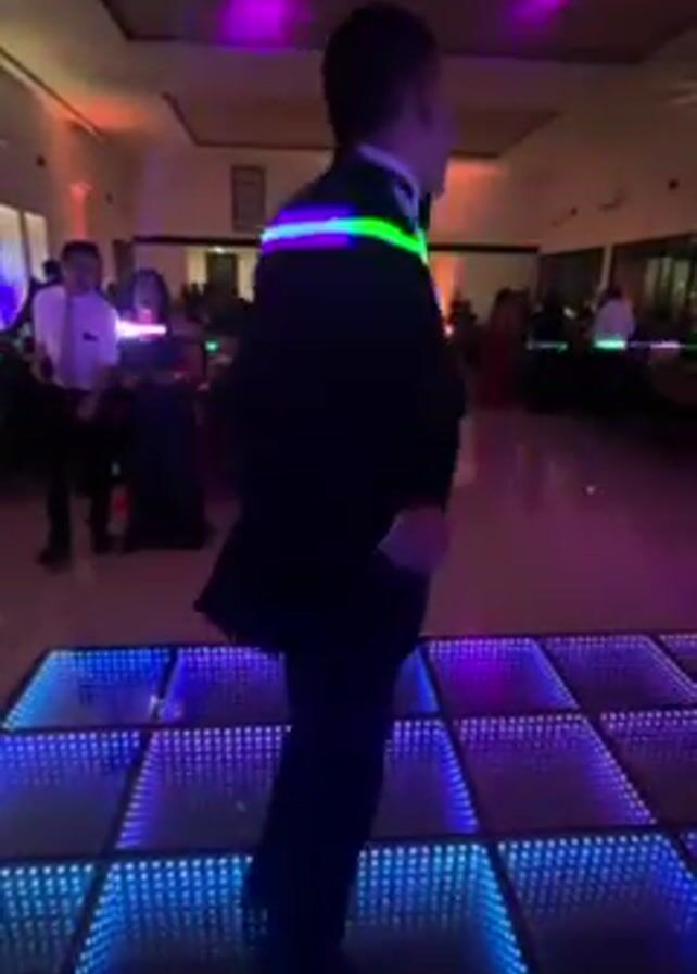 A man in a black tuxedo dances enthusiastically on a light-up, grid-patterned dance floor at what appears to be a formal event