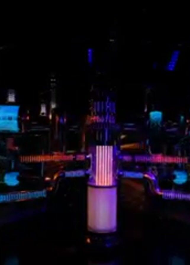 The video presents a dark, enclosed space with a complex, centrally located structure. The structure is composed of pipes, cylinders, and glowing elements in blue, orange, and purple. There are two horizontal cylindrical sections on either side of the central structure that feature a digital display. The display seems to show the image of train cars with graffiti on them. There is a column in the center of the frame that glows with pink and purple light. Above the structure are numerous small, blue lights arranged in a grid pattern. In the background, on either side of the structure, there are abstract digital projections featuring colors and patterns. Silhouettes of people can be seen in the lower corners of the frame.