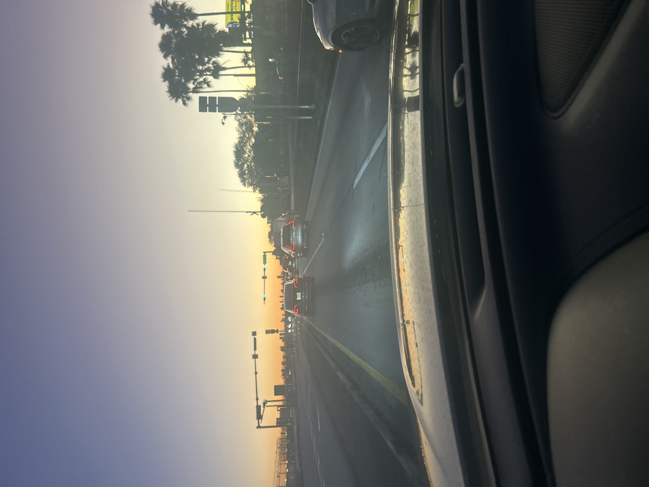- "The image presents a forward-facing view from inside a vehicle on a multi-lane urban roadway during twilight, displaying a sky gradient from deep blue to orange and yellow at the horizon" by FM-YlV0A2, licensed under CC BY 4.0