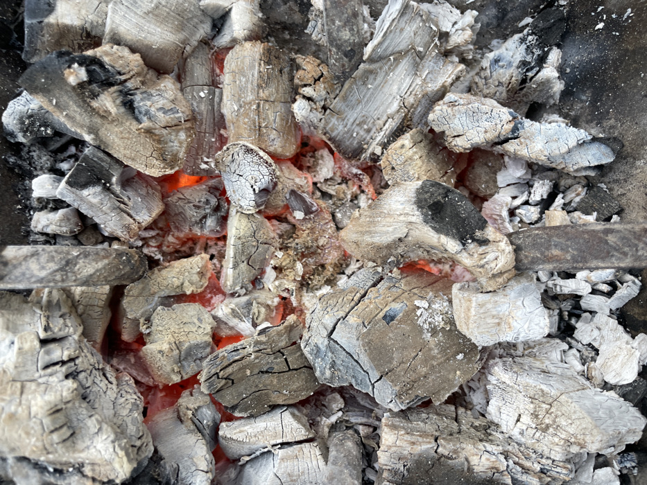 - "Glowing embers peek through the ash-covered remains of burnt wood" by FM-U22D42, licensed under CC BY 4.0